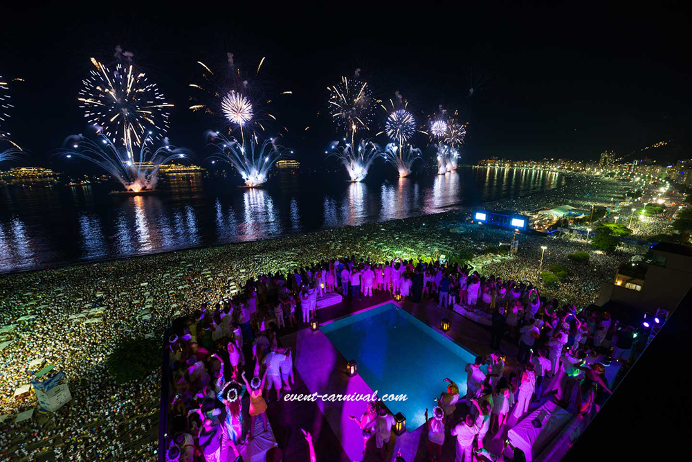 Datanglah ke Copacabana Beach di Rio De Janeiro pada malam tahun baru, Anda akan menjadi bagian dari pesta tahun baru terbesar dan terliar di dunia. Pesta kembang api, tradisi melempar bunga ke laut, musik mengentak di mana-mana, dansa-dansi semalam suntuk, panggung-panggung pertunjukan, makanan, minuman – you name it, semua euforia pesta ada di sepanjang garis pantai 2,5 mil dengan dua jutaan orang memadatinya. Mayoritas orang yang berpesta di sini memakai baju serba putih yang dipercaya akan membawa keberuntungan.