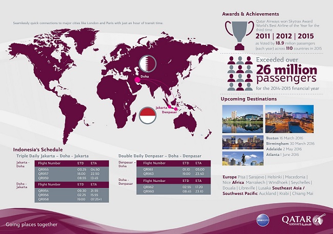 Saat ini Qatar Airways mengoperasikan 35 penerbangan setiap minggunya dari Jakarta dan Denpasar. Qatar Airways menyediakan penerbangan sehari tiga kali dari Jakarta-Doha serta Denpasar-Doha. Dengan beroperasinya Boeing 787 Dreamliner sejak November 2015 dari Jakarta ke Doha, Qatar Airways merupakan pelanggan pertama dari Boeing Dreamliner dari Timur Tengah dan merupakan operator kedua terbesar dengan jumlah 27 pesawat Dreamliner saat ini.