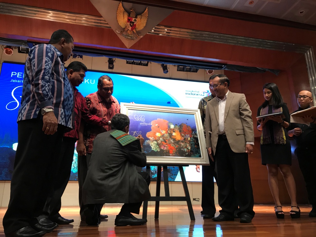 Putu Ngurah menandatangani foto cover buku Sikka Underwater