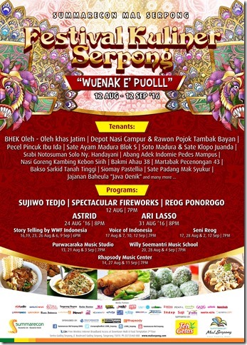 ??Untuk keenam kalinya kembali Summarecon Mal Serpong (SMS) yang menjadi penggagas event kuliner pertama di area Tangerang menghadirkan Festival Kuliner Serpong (FKS). Event festival kuliner tahunan ini akan dilaksanakan selama satu bulan penuh, mulai tanggal 12 Agustus - 12 September 2016 dengan tetap membawa misi memperkenalkan budaya nusantara sebagai ciri khas kulinernya. Hal ini juga menjadi dasar digelarnya event FKS dan menjadi wujud nyata dedikasi Summarecon untuk turut melestarikan kebudayaan tanah air melalui suguhan event-eventnya. Tahun ini SMS tertantang untuk kembali membedah dan menggugah ingatan akan kekayaan warisan kuliner nusantara khususnya Jawa Timur dengan mengangkat tema "Wuenak E' Puolll". Setelah berhasil memperkenalkan kekayaan budaya dan kuliner daerah-dareh pilihan mulai dari “Beauty Of Bali” (2011) dari Bali, “Minang nan Rancak” (2012) dari Sumatera Barat, “Jawa Sing Ngangeni” (2013) dari Jawa Tengah "Sulawesi Nyamanna'... Pe Sadap" (2014) dari Sulawesi, dan “Horas...Beta Mangan Hita” (2015) dari Sumatera Utara. Kini SMS mengeksplore ragam makanan serta kesenian Jawa Timur dalam tema “Wuenak E' Puolll” dan siap memuaskan hasrat para pengunjung setia SMS yang ingin mencicipi lezatnya kuliner khas daerah yang terkenal sebagai kampung dari Arek-arek ini.
