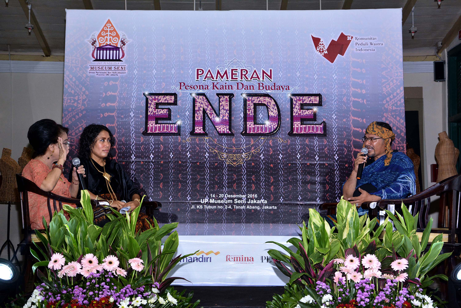 Pada pembukaan pameran ini dipersembahkan sebuah tarian tradisional dari Ende yaitu Tari Maimimu yang dilanjutkan dengan talkshow yang menghadirkan Ibu Bernadetha Maria Sere Ngura Aba (Ibu Sere) selaku Pemerhati Sosial Ekonomi untuk Kain Tenun khususnya Ende. Ia mengatakan, “Kain Tenun Ende kini kehilangan momentum untuk berkembang. Kini Kain Tenun Ende hanya dianggap sebagai komoditas belaka yang seharusnya menjadi khazanah dan kekayaan budaya nasional yang multikultural.” Begitu juga dengan Pak Ali Abubekar sebagai Pengelola Museum Tenun Ikat di Kabupaten Ende dan Pembina Kelompok Pengrajin Tenun yang hadir sebagai pembicara utama talkshow ini mengungkapkan, “Saat kesadaran dan apresiasi masyarakat menurun terhadap Kain Tenun Ende, maka timbul dampak yang kurang baik bagi pengrajin itu sendiri. Padahal sebagian besar dari mereka sangatlah bergantung pada hasil kerajinan tangan ini. Hingga saat ini bantuan masih sangat diharapkan dalam hal pemberdayaan, pelatihan teknik menenun, penggunaan bahan-bahan alami, permodalan hingga pemasaran.”