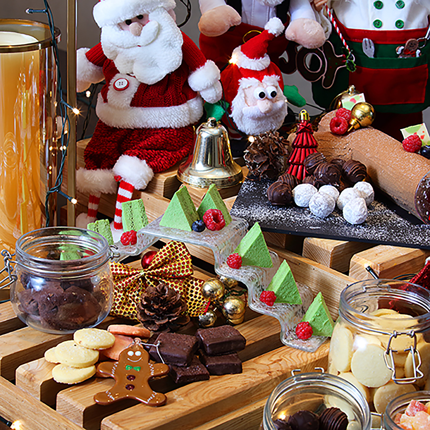 Nikmati sandwiches mini, scones spesial dengan selai, krim dan kue Natal mini di Lobby Lounge.
