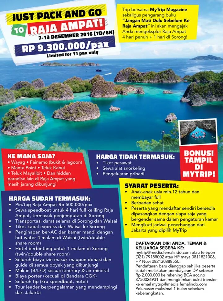 - Pendaftaran baru dianggap sah jika sudah membayar DP mnimal RP. 2.000.000,- dan mengirimkan bukti transfer ke : mytrip@media.femalindo.com CC: pelanggan@media.femalindo.com